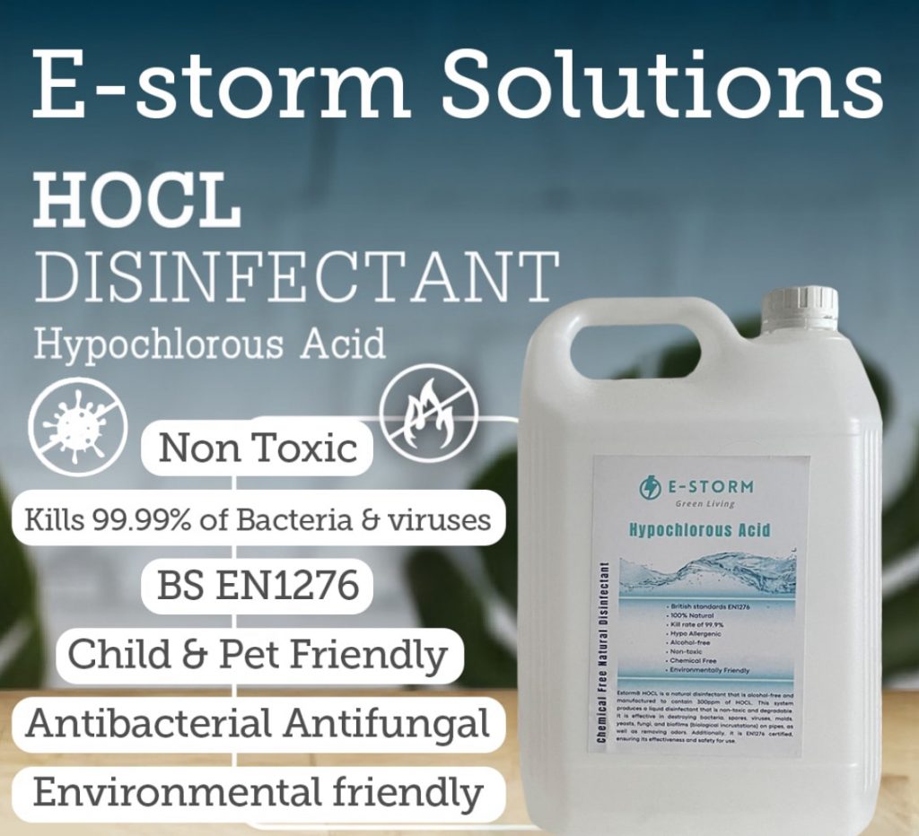 E-Storm HOCl is: Tested to BS EN 14476, EN 1276, and EN 13697 standards - Proven to kill 99.999% of bacteria, viruses, and fungi - Effective against SARS-CoV-2, norovirus, MRSA, and other airborne or contact-transmitted pathogens.